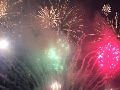 20時、ナイアガラの花火を背景に神輿とふとん太鼓が写しだされ、祭りはクライマックスを迎えました。その後、色とりどりの花火が打ち上げられ、大和川の川面に写しだされました。花火との距離が近く、迫力ある花火を楽しむことができました。