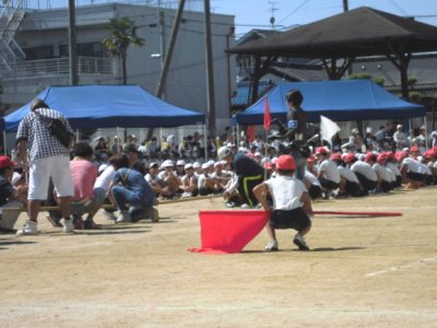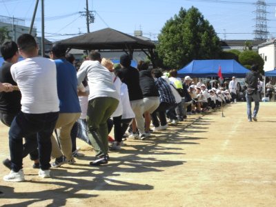 保護者対6年生で「つなひき」を2試合行いました。保護者チームは体格のいい方が60人。一方、6年生チームは児童88名に先生も加わって対決しました。結果は、1勝1敗の引き分けに終わりました。