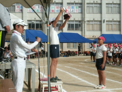 14時40分、最後のプログラム「終わりの体操」の後、「閉会式」が行われました。成績発表の後、白組に優勝杯を、赤組に準優勝盾が授与されました。最高のお天気のなか、大きな怪我もなく無事終了しました。