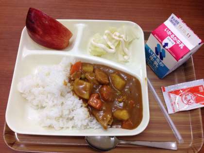 カレールウは小麦粉不使用で、米粉が原料になっています。キャベツのサラダは、卵不使用のノンエッグドレシングが1人1袋ついています。今日のりんごは、「サンつがる」でした。