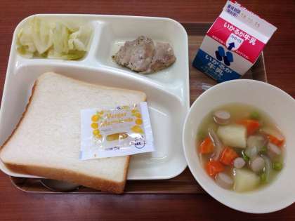 10月9日(火)のこんだては、「鶏肉の香草焼き、スープ煮、サワーキャベツ、食パン、マーマレード、牛乳」です。