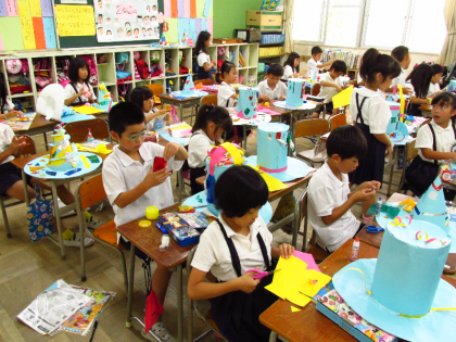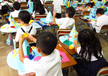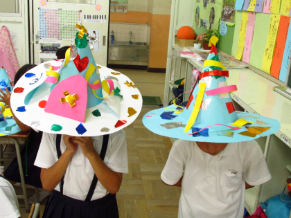 紙を切って丸めて帽子を作っています。三角のとんがり帽子と筒みたいなシルクハットの、どちらか好きな方を決めて飾りをつけていきます。自分だけの素敵な、かわいい、おもしろい帽子がたくさん仕上がりそうです。