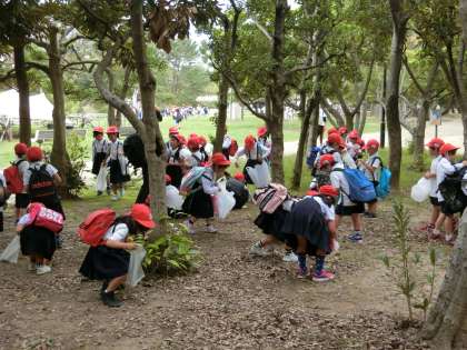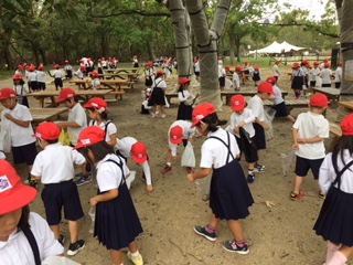 10月10日(水)、1年生の87名は、秋の遠足で「長居公園」にやってきました。9時30分に「植物園」に入園し、大池の周りを散策しながら、芝生広場まで来ました。クヌギの木のしたで、どんぐりひろいをしました。