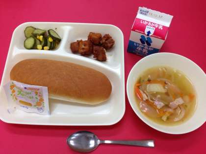 10月11日(木)のこんだては、「まぐろのオーロラ煮、スープ、きゅうりとコーンのゆずドレッシング、コッペパン、アプリコットジャム、牛乳」です。