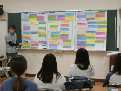 放課後は、全教員が参加して研究討議会【写真右】を行いました。新学習指導要領の本格実施に向けて「主体的・対話的で深い学び」について、ワークショップも行いました。