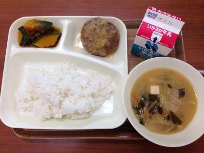 10月18日(木)のこんだては、「和風おろしハンバーグ、みそ汁、かぼちゃのいとこ煮、米飯、牛乳」です。