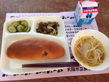 10月19日(金)のこんだては「牛肉のカレー風味焼き、トマトのスープスパゲッティ、きゅうりのサラダ、レーズンパン、牛乳」です。