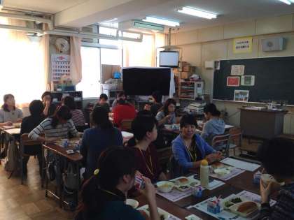 はじめに、大阪の食文化や大阪市の学校給食について、クイズをしたり、「大阪市の学校給食ができるまで」の動画を見たりしながら知ってもらいました。その後、子どもたちと同じ給食を試食しました。配膳も自分たちで行い、子どもたちの給食の様子を体験してもらいました。みんなでおしゃべりをしながら給食を食べ、楽しい試食会でした。来年度も開催しますので、ぜひご参加ください。