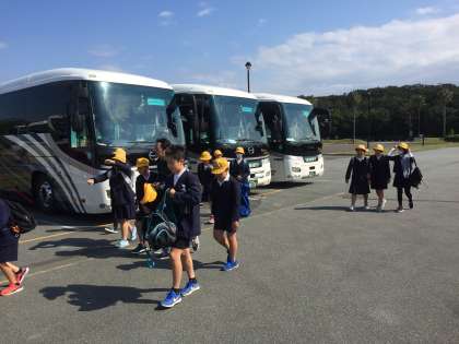 11時5分にバスは「志摩スペイン村」に到着しました。今日は木曜日のため、駐車場にはたくさんの修学旅行のバスが停まっていました。