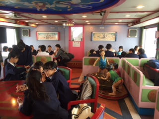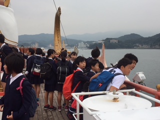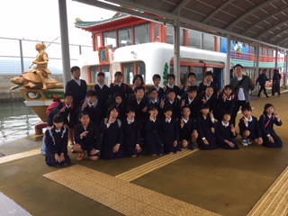 8時40分、鳥羽マリンターミナルに着きました。早速、乗り場でクラス写真をとりました。9時に遊覧船「龍宮城」に乗船し、「鳥羽湾めぐり」をしました