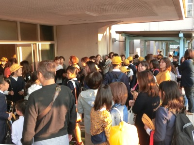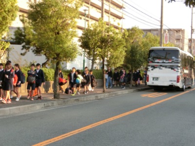 16時15分、修学旅行の予定したプログラムを無事に終え、予定より少し早く到着しました。道路にはたくさんの保護者の方々や教職員が出迎えてくれました。