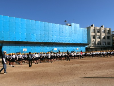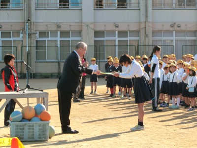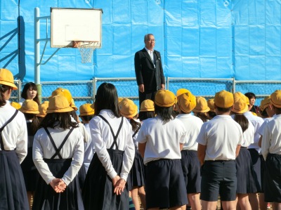 10月22日(月)始業前、バドミントン大会の賞状伝達【写真左】の後、校長先生から「ルールを守ろう」というお話がありました。