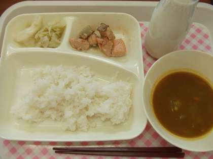 「さけのしょうゆマヨネーズ焼き、とうがんのカレースープ、サワーソテー、