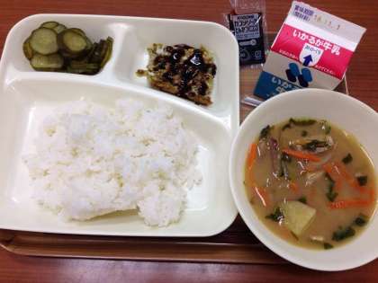 10月26日(金)のこんだては、「お好み焼き、豚汁、きゅうりの梅風味、ごはん、牛乳」です。