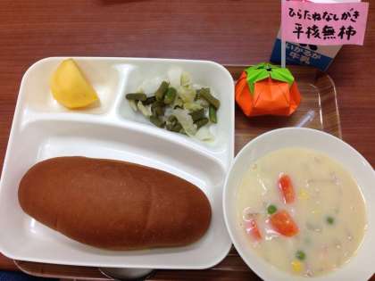 10月30日(火)のこんだては、「コーンクリームシチュー[米粉]、キャベツと三度豆のサラダ、かき(平核無柿)、黒糖パン、牛乳」です。