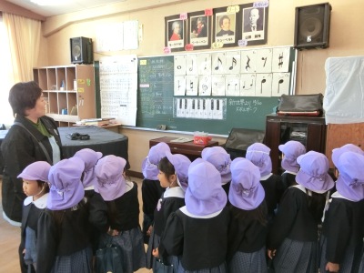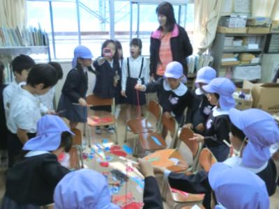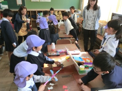 64名の園児は校長先生に先導され、保健室からプール、体育館、図書室、音楽室などの教室や校舎をまわりました。そして、1年生の各教室にやってきました。教室では1年生が空き箱やどんぐり、松ぼっくりなどで作ったおもちゃで遊びやゲームをしました。1年生はちょっぴりおにいさん、おねえさんになって、終始和やかな雰囲気で交流会が進みました。最後は、校庭の土俵をみてさようならをしました。