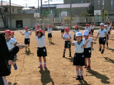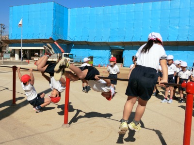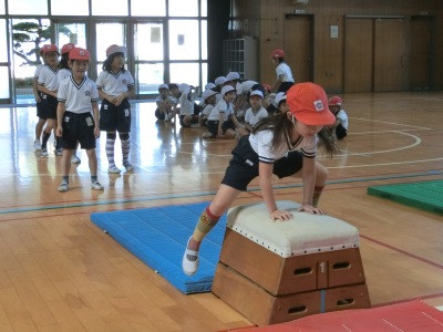 1組は運動場で「鉄棒」をしました。前まわりおりと逆上がりの学習でした。前まわりおりは、ほぼ全員の児童ができました。2組は体育館で「跳び箱」の授業で、跳び箱の運び方や跳んだ後の合図、跳び乗りや手を着いてのまたぎ乗りを学習しました。3組は運動場で、「なわとび」の授業でした。前どび、後ろとび、かけ足とびなどを学習しました。