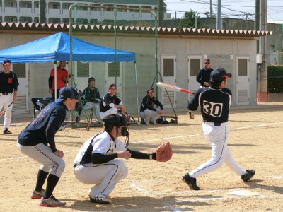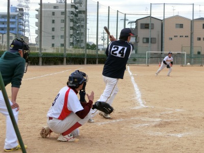 長吉小学校は第3試合で長吉出戸小学校と対戦【写真左】し、6本のホームランを打ち、13対5で勝利しました。午後からの第4試合は決勝戦で、長吉西中学校と対戦【写真右】しました。6回まで戦い、結果は13対7で、見事に優勝しました。PTAの選手の皆さん、お疲れさまでした。