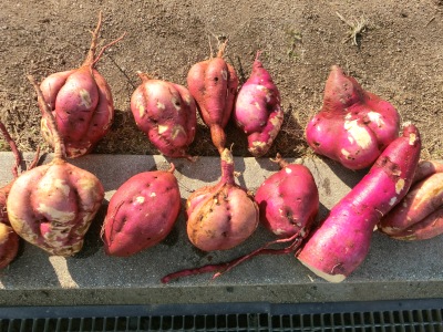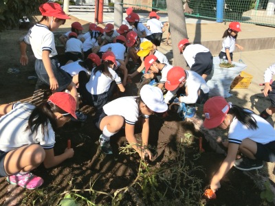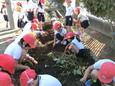 子どもたちは、サツマイモのついた蔓(つる)をひっぱり、顔を出したおイモさんに出会って感激の面持ちでした。スコップを上手に使って小さく細いものから、丸い大きなものまで収穫ました。学習園では「収穫の秋」を感じる光景が広がっていました。