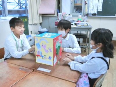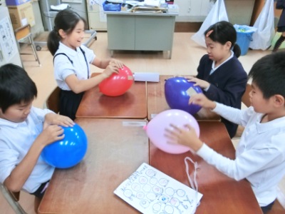 「ドキドキボックス」は、箱の中に入っている5つの物を当てました。「宝さがし」は、教室の中に隠されているお宝をみんなで協力して見つけるゲームでした。「風船テープはがし」は、風船に貼られたガムテープやセロハンテープをはがしていくいくゲームでした。風船が割れるとアウトです。