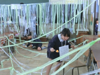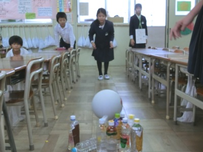 「THE・まとあて」は、1組のペアが紙のボールを5球持って、的をめがけて投げて、点数を競うゲームでした。「ラウンド2」は、低学年と高学年にわかれて、水を入れたペットボトルを倒すボーリングでした。「ミッションインポッシブル」では、お玉にピンポン玉を乗せて、障がい物をよけながらゴールをめざしました。