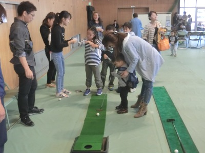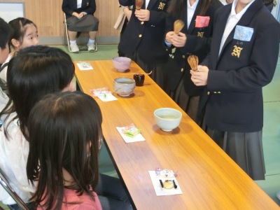 講堂では教職員が担当した「ストラックアウト」や歴代PTA会長担当の「パターゴルフ」が行われ、景品が渡されました。また、長吉西中学校茶道部による「お抹茶体験」も行われました。