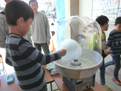 「わたがし」は、好みの色のザラメを入れて、一人ずつ自分で丸めていきました。他には、水あめやクロワッサン、ジュースなどが販売されましたが、すべてが完売しました。