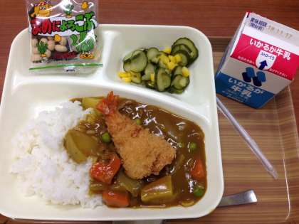 11月12日(月)のこんだては、「えびフライカレーライス、きゅうりとコーンのサラダ、豆こんぶ、牛乳」です。