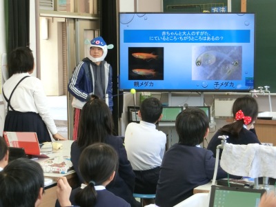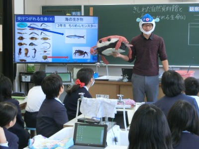 11月16日(金)3限、5年生は理科室で「受けつがれる生命〜海にすむ生き物たち〜」の授業がありました。今日は3年生のチリモンでお世話になった「きしわだ自然資料館」の学芸員さんも来ていただきました。