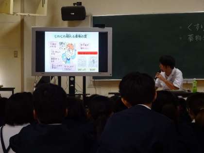 薬の種類や働き、副作用などを教えてもらい、くすりを飲むときの7つの約束などを学びました。後半の「薬物乱用防止」の学習では、マウスのビデオや体験談のビデオを見せていただき、わかりやすくお話していただきました。