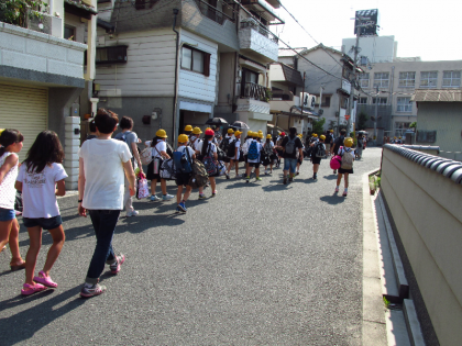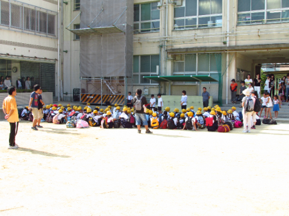 5年生が林間学習から帰ってきました。みんな、たくさんの思い出ができたようです。バスを降りると、疲れ切った体に大阪の暑さは厳しかったようですが、帰校式も無事終えて帰路につきました。