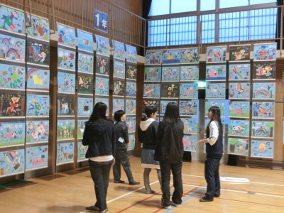 11月28日(木)放課後、明日からの「作品絵画展」の準備を教職員全員で行いました。各学年の絵画作品は、透明のホルダーに入れて、体育館のギャラリーにぶら下げていきました。