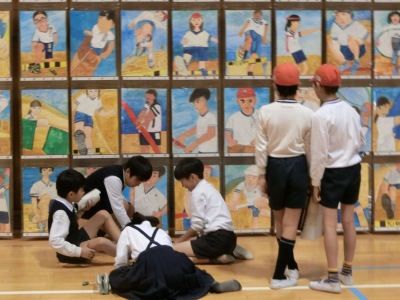 11月29日(木)1限、1年生から順に体育館で「作品絵画展」の鑑賞をしました。「作品鑑賞カード」を持って、良かった作品の工夫しているところや感想を書いていました。