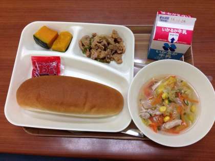 12月20日(木)のこんだては、「豚肉のケチャップソテー、はくさいのスープ、焼きかぼちゃ、コッペパン、いちごジャム、牛乳」です。