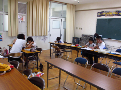 今週の金曜日(8月1日)まで、プール開放をしています。そのプールの前後に学習会をしている学年があります。夏休みの宿題を先生に教えてもらったり、友達と一緒に考えたり・・・。