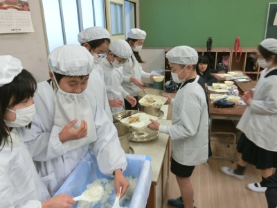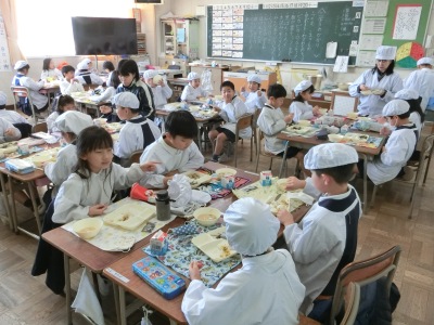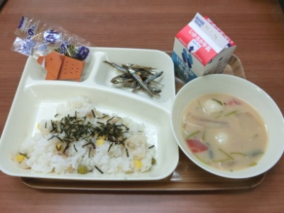 1月8日(火)、今年初めての給食は、正月の行事献立で「れんこんのちらしずし、ぞう煮、ごまめ、牛乳」です。