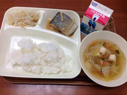 1月10日(木)のこんだては、「さばのみそ煮、五目汁、もやしの甘酢あえ、ごはん、牛乳」です。