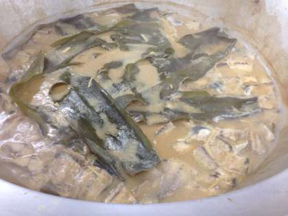 さばのみそ煮は、釜にだしこんぶを敷き、みそ、砂糖、みりんの調味液にしょうがを加え、骨付きのさばを並べて煮ます。甘めのみそ味で、ごはんによく合います。骨があって食べるのが大変でしたが、上手に食べられたでしょうか?
