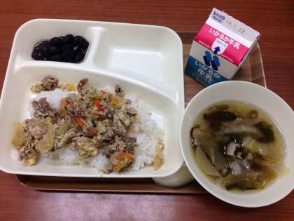 1月16日(水)のこんだては、「他人丼、すまし汁、黒豆の煮もの、牛乳」です。