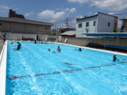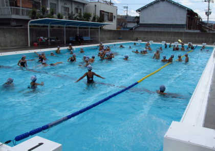 毎日たくさんの子供たちがプール開放に来ます。潜ったり泳いだり、友達とおにごっこや水のかけあいっこなどみんな楽しそうです。