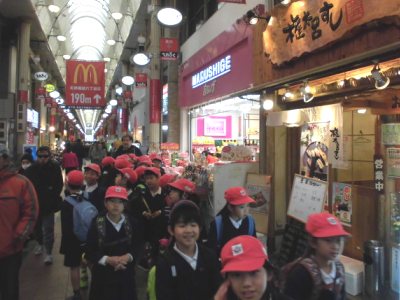 館内3階ホールでは、昔の道具クイズや灯りの実験など「体験学習」をしました。その後、10階へ移動し、江戸時代へタイムスリップした「なにわの町家」【写真左】を探訪しました。さらに8階では、明治から昭和に至る町の表情や、暮らしぶりを模型で再現したミュージアム、「モダン大阪パノラマ遊覧」【写真中】を見学しました。再び3階ホールに戻ってお弁当をいただいた後、日本一長い「天神橋筋商店街」【写真右】を扇町まで歩いて見学しました。今後の社会科の学習に活かしたいと思います。