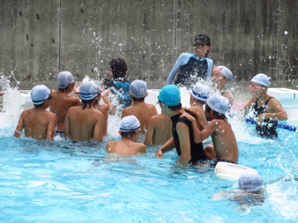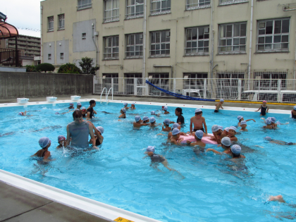 今日は、あいにくの曇空でしたが、大勢の子供たちが参加しました。担任の先生やミック先生と一緒にはしゃぎ、今年最後のプール開放を満喫していました。