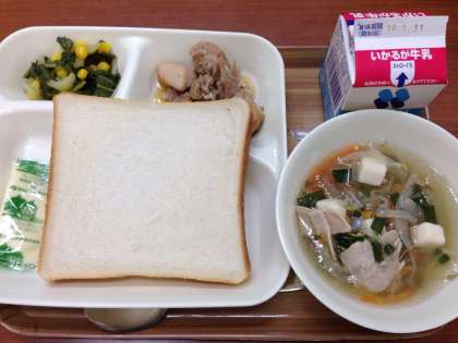 1月25日(金)のこんだては、「鶏肉のオイスターソース焼き、糸寒天のスープ、チンゲンサイとコーンの中華あえ、食パン、マーガリン、牛乳」です。