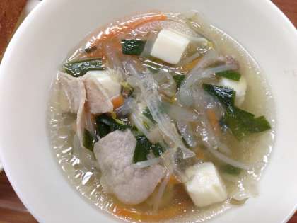 スープに使っている糸寒天は寒天とこんにゃく粉からできていて、ぷりっとした食感です。不足しやすい食物せんいをとることができます。