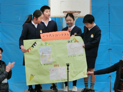 その後、健康委員会からは今週の「健康週間」についてお知らせがありました。図書委員会からは「イラストコンテスト」の金・銀・銅賞の発表が、美化委員会からは「放送クイズ」についてお知らせがありました。