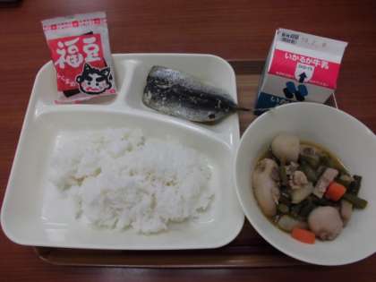 今日は節分の行事献立「いわしのしょうがじょうゆかけ、含め煮、いり大豆、ごはん、牛乳」です。