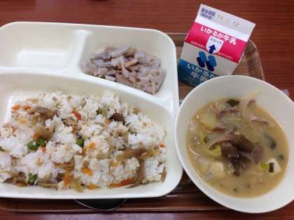 2月6日(水)のこんだては「鶏ごぼうご飯、干しずいきのみそ汁、焼きれんこん、牛乳」です。