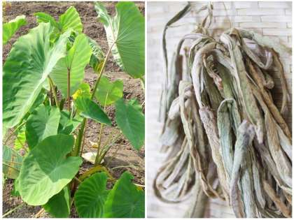 「ずいき」は里芋の葉柄の部分で、皮をむいて乾燥させたものが干しずいきです。昔から保存食として利用されてきました。アクがあるので、よくもみ洗いした後ぬるま湯で戻し、下ゆでしてからみそ汁の具に使用しています。