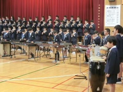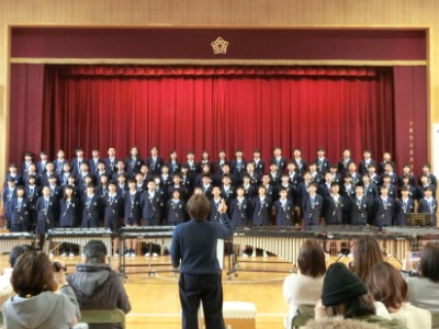 6年生3クラスは、講堂で「音楽発表会 〜心を合わせて〜」で9曲、合唱や合奏を行いました。