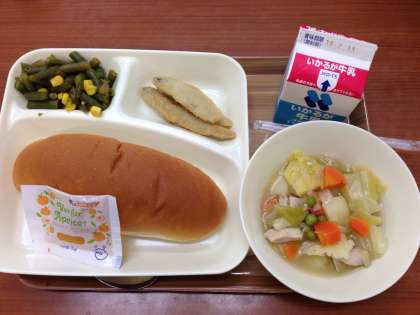 2月7日(木)のこんだては「わかさぎフライ、スープ煮、三度豆とコーンの甘酢あえ、コッペパン、アプリコットジャム、牛乳」です。